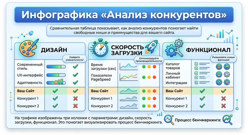 Сравнительная таблица показывает, как анализ конкурентов помогает найти свободные ниши и преимущества для вашего сайта. Описание: На графике изображены три колонки с параметрами: дизайн, скорость загрузки, функционал. Это помогает визуализировать процесс бенчмаркинга.