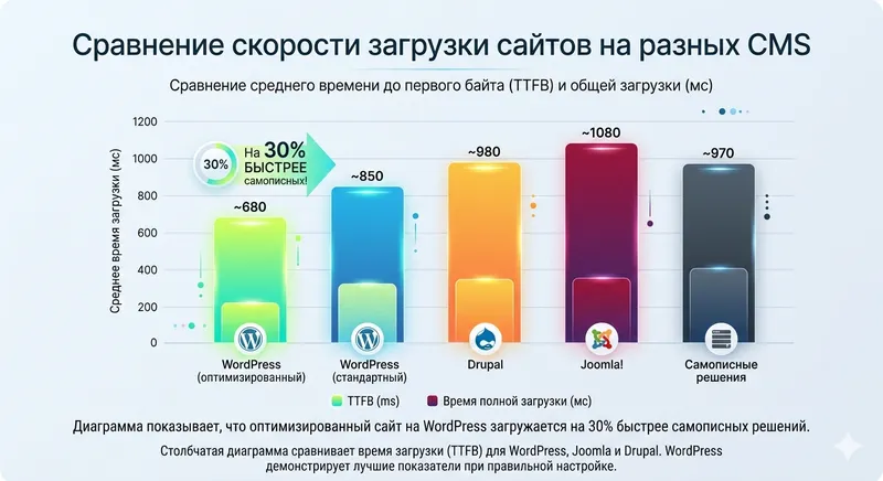Диаграмма показывает, что оптимизированный сайт на WordPress загружается на 30% быстрее самописных решений. Описание: Столбчатая диаграмма сравнивает время загрузки (TTFB) для WordPress, Joomla и Drupal. WordPress демонстрирует лучшие показатели при правильной настройке.